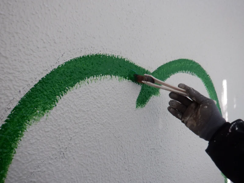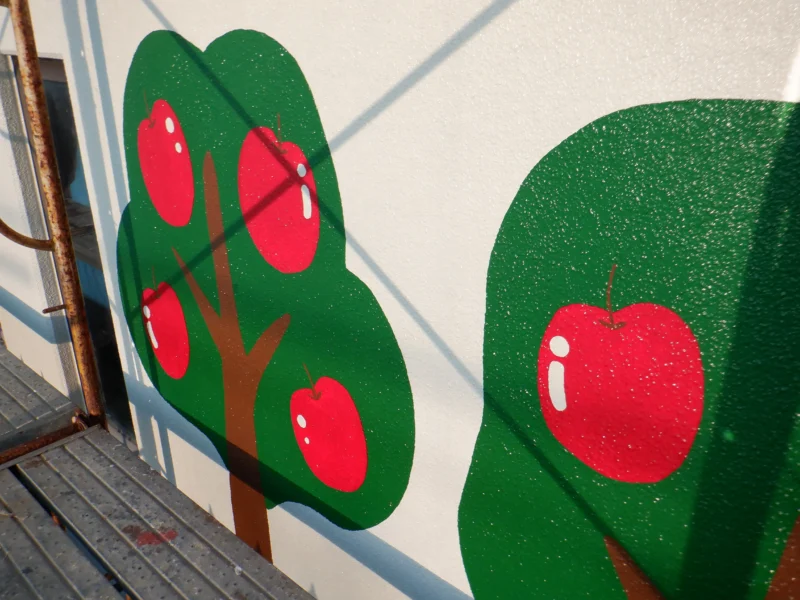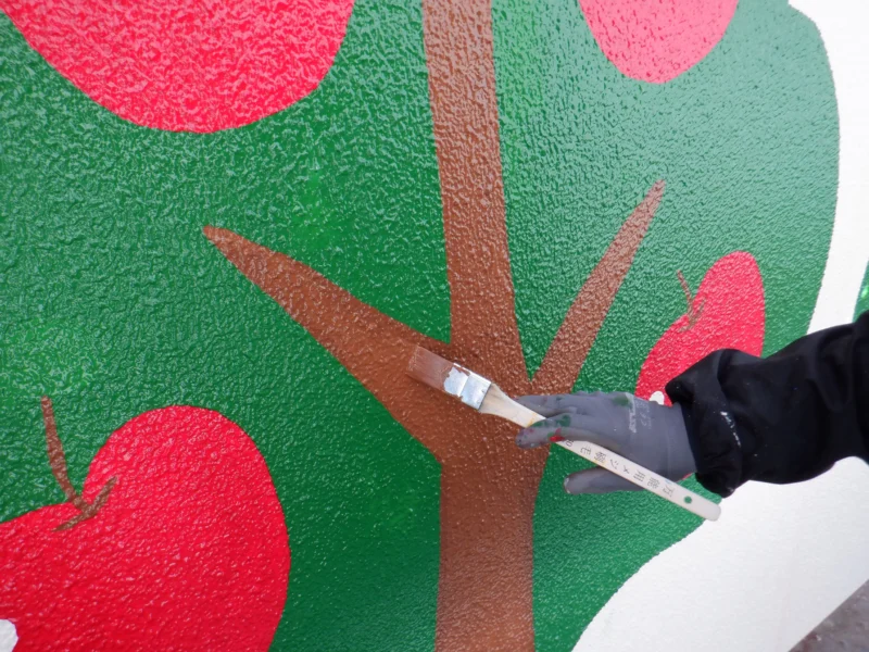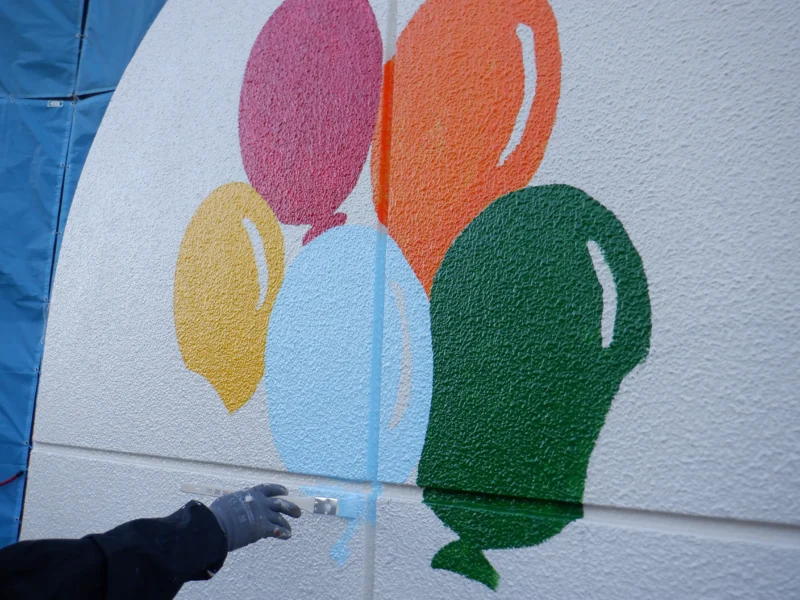 こちらの現場では、外壁に描かれていたイラストも長い年月を経て色あせてしまっていたため、今回描き直しをさせていただきました。
